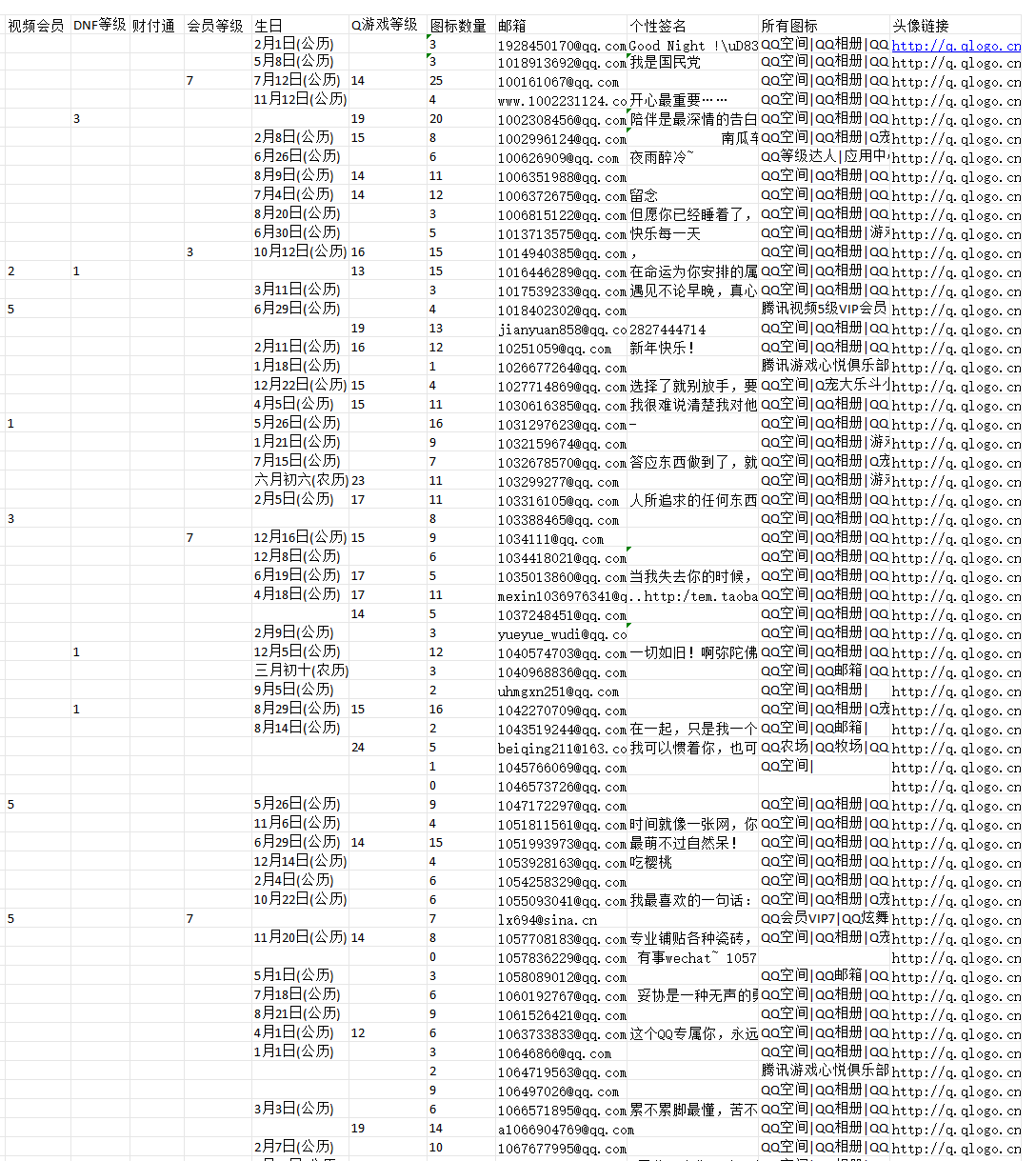 可以提取的信息有好友的QQ号、头像、昵称、地区、等级、实名状态、职业、生日等信息,非常详细